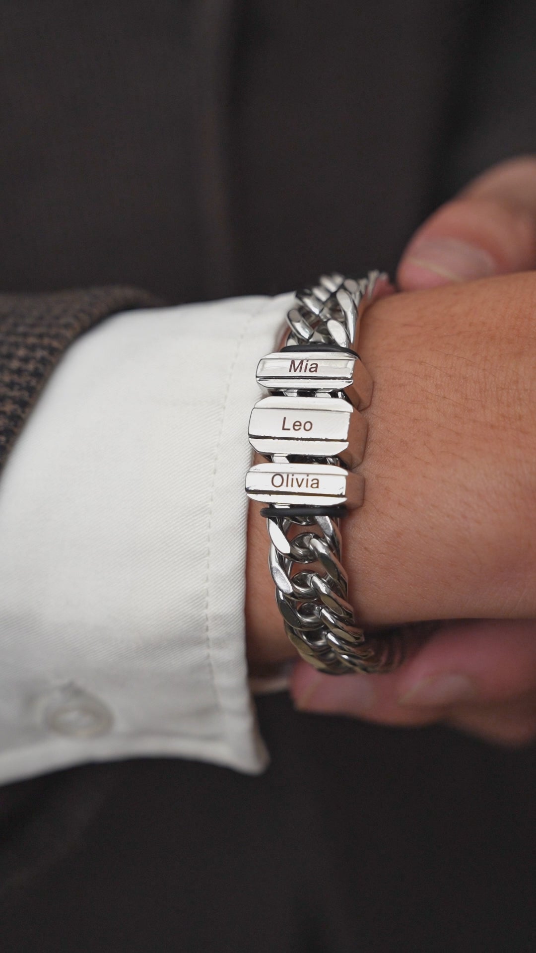 - Custom Engraved Charms: Make the bracelet uniquely yours by engraving each charm with a name, set of initials, a memorable date, or an inspiring word. Whether you choose one charm or several, each engraving represents a loved one, family member, partner or child—allowing you to carry them with you every day.