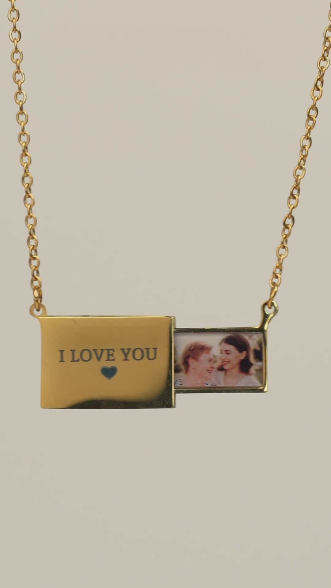- Envelope Photo Design: This beautifully crafted envelope necklace brings together heartfelt words and cherished memories in one meaningful keepsake. The outer plate can be engraved with your own message, while the hidden photo inside keeps your most treasured moment close — a thoughtful blend of sentiment and style.