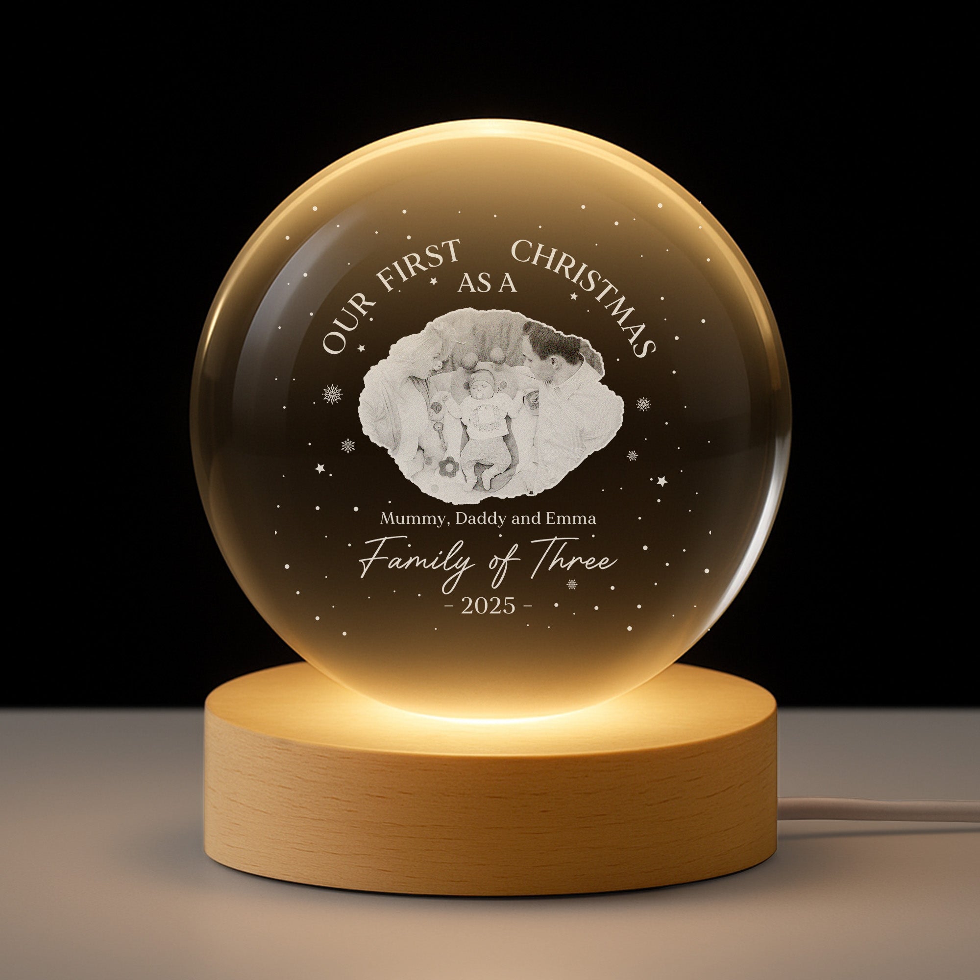 Personalised First Christmas as a Family of 3 Photo Crystal Ball Lamp