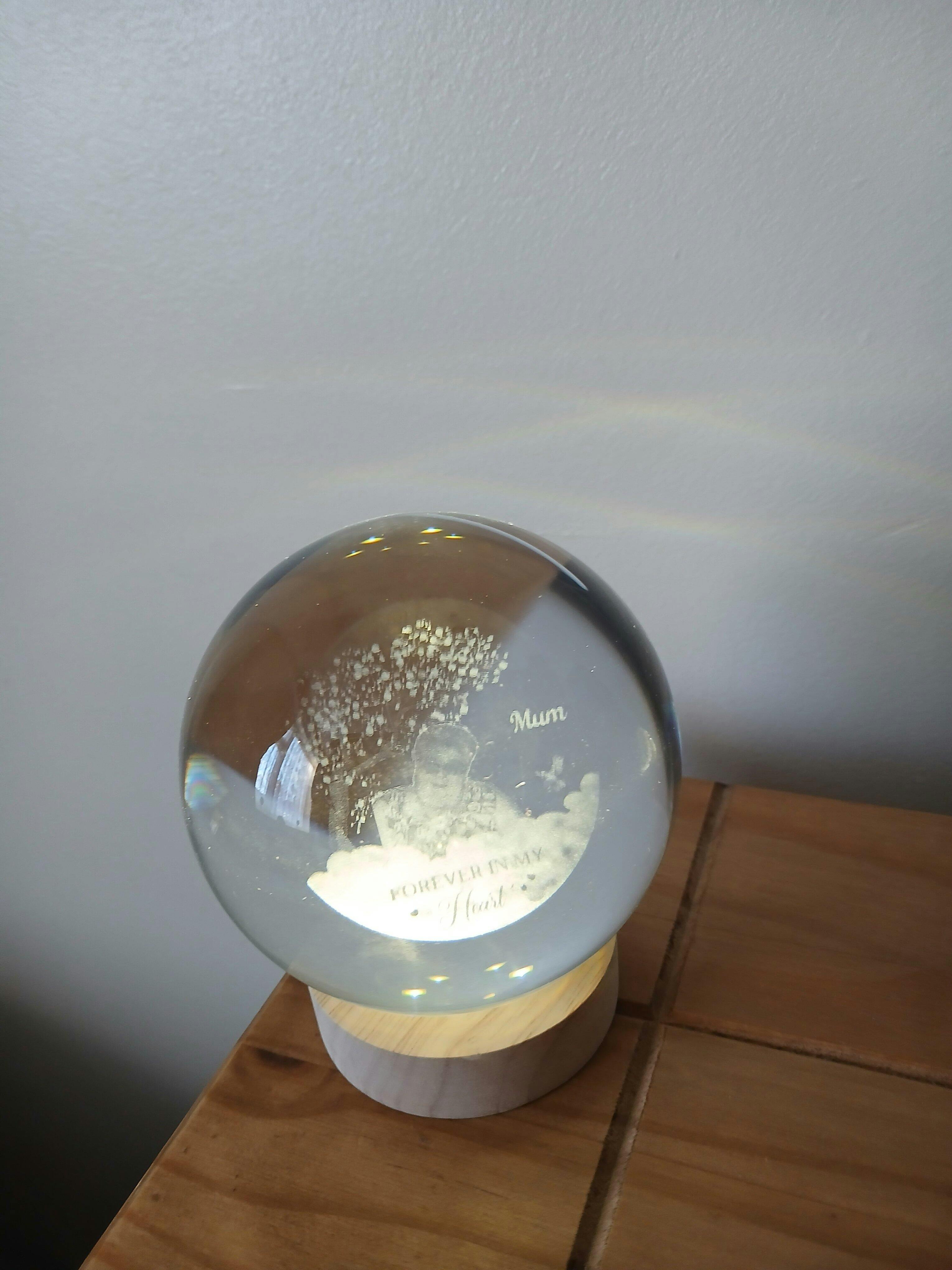 - What’s included: 1 crystal globe and 1 wooden LED base with a USB power cable.